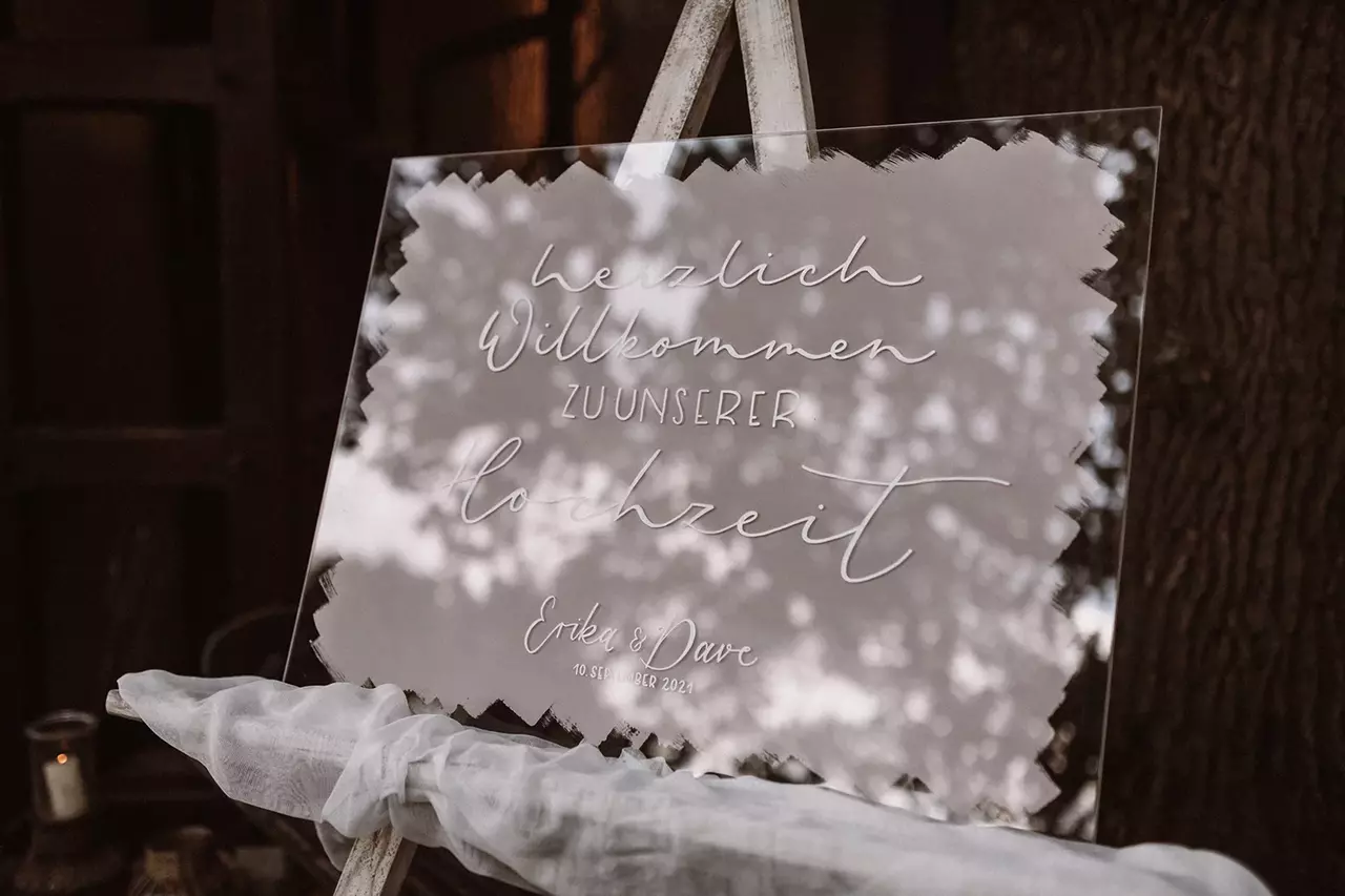 Tauche ein in die Welt der Hochzeitsschilder aus Acryl und entdecke, wie diese klaren Konturen aus glänzendem oder mattem Acryl von seeleherzundhand nicht nur Eleganz verleihen, sondern auch die Liebe auf deiner Hochzeit in zeitloser Schönheit festhalten.
